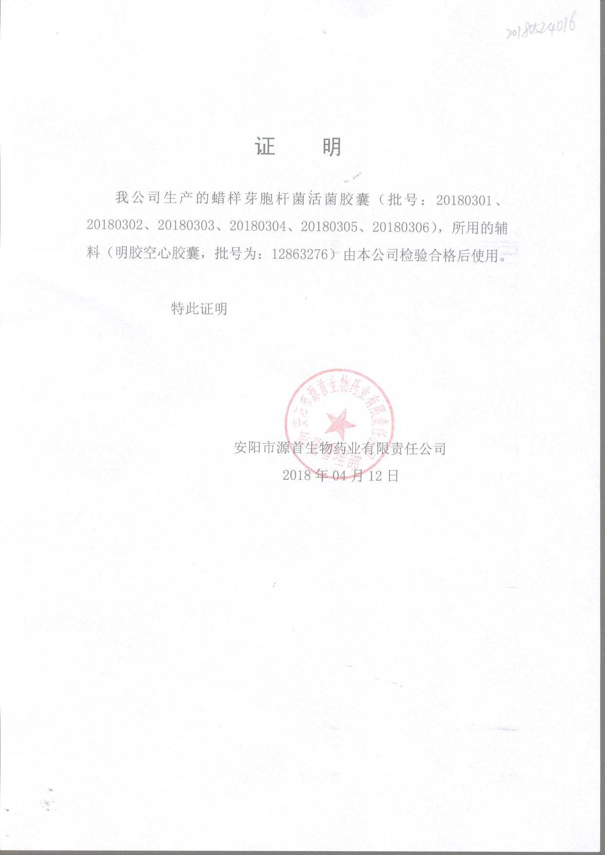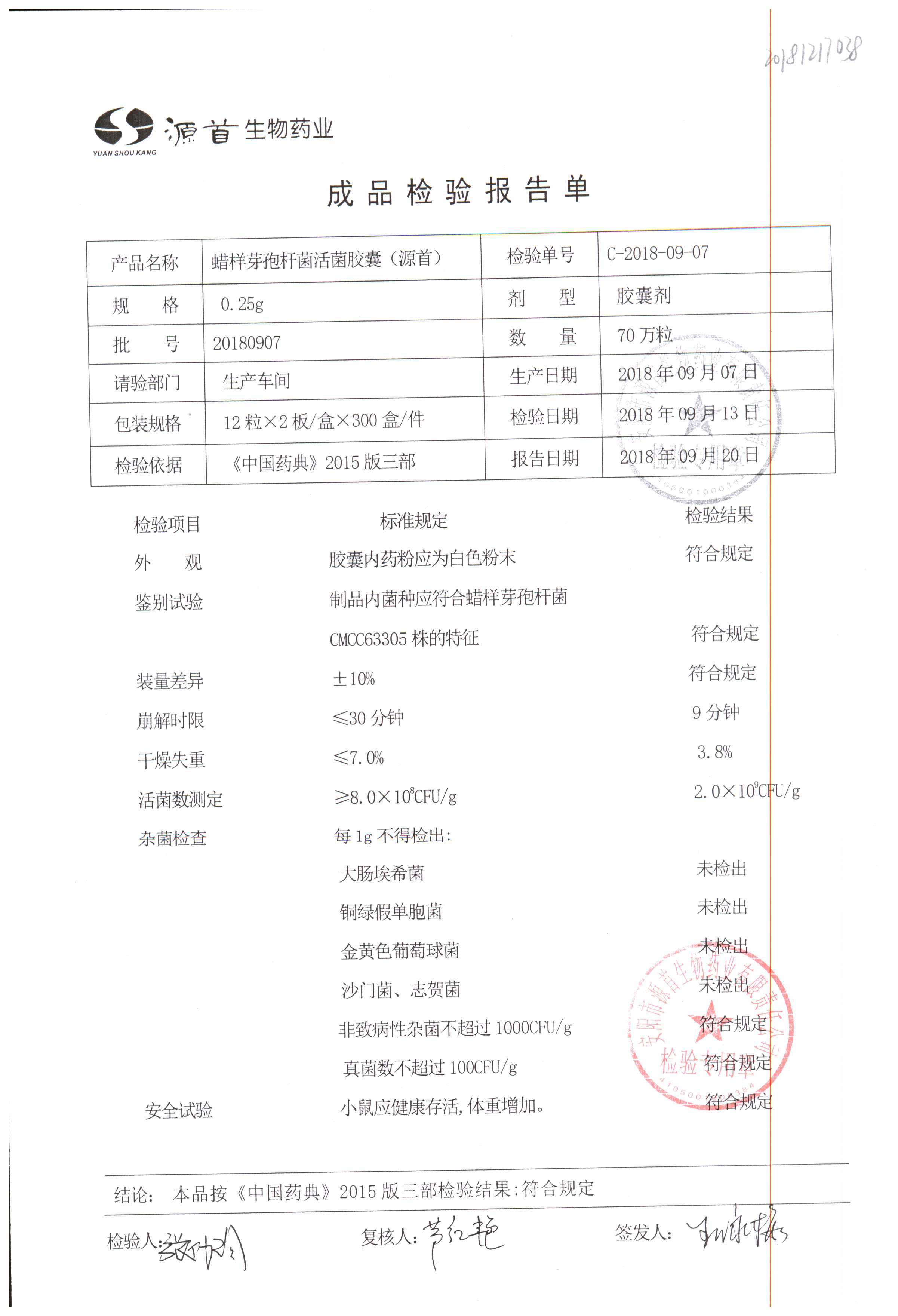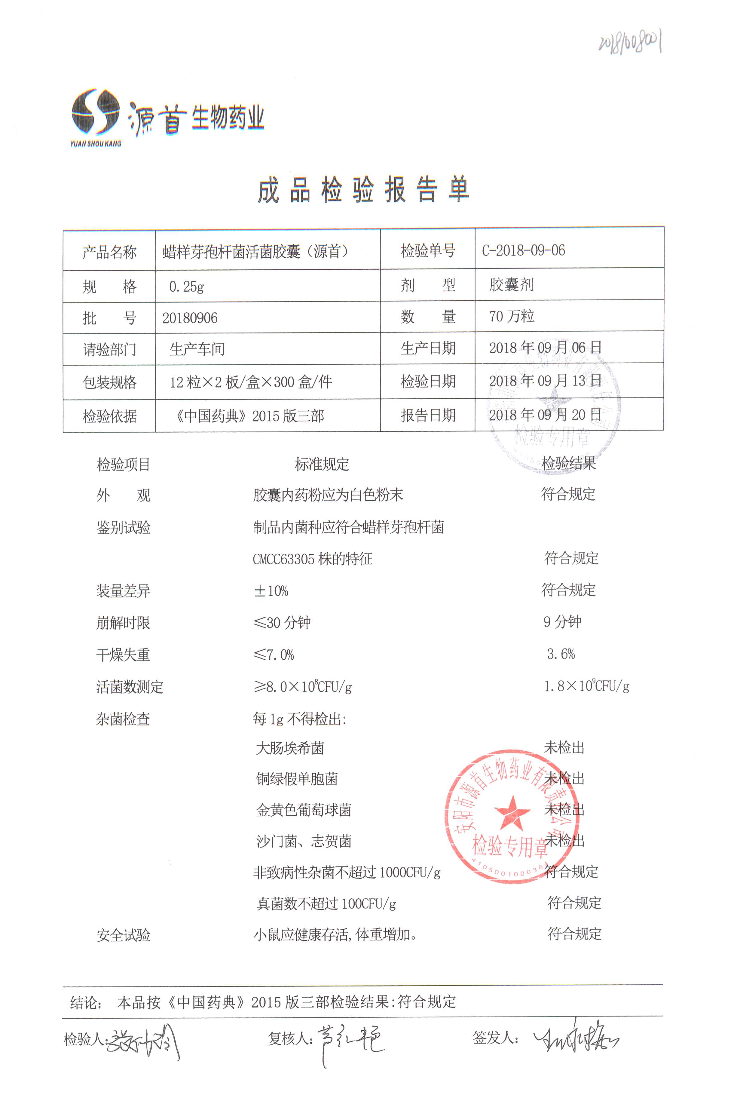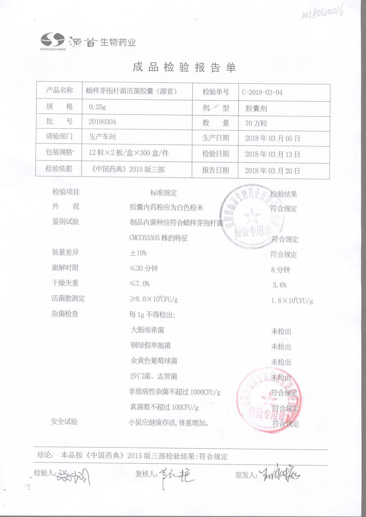 | 蠟樣芽孢桿菌活菌膠囊(源首) | 0.25g | 20180907(2/3) | 查看詳情 |