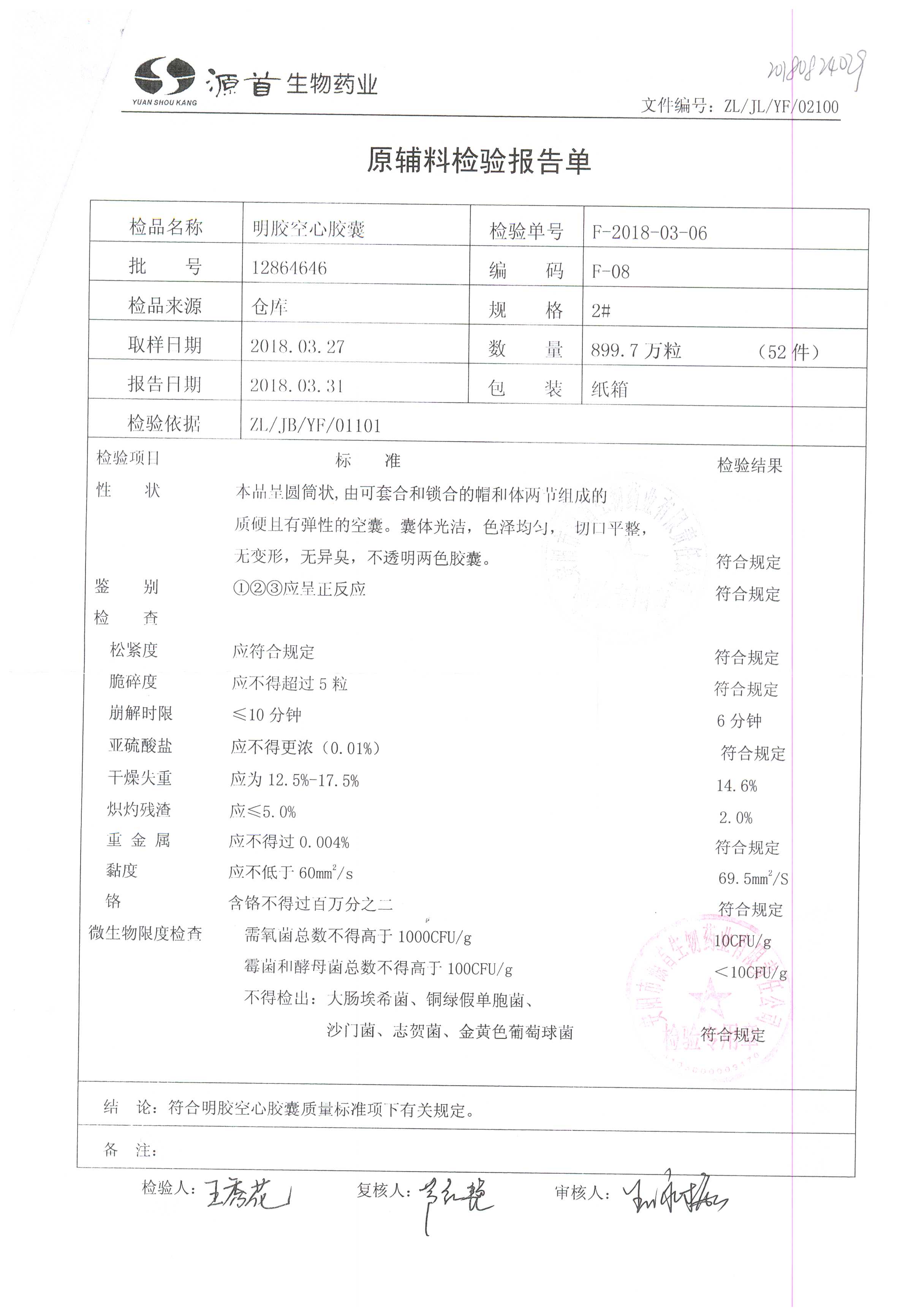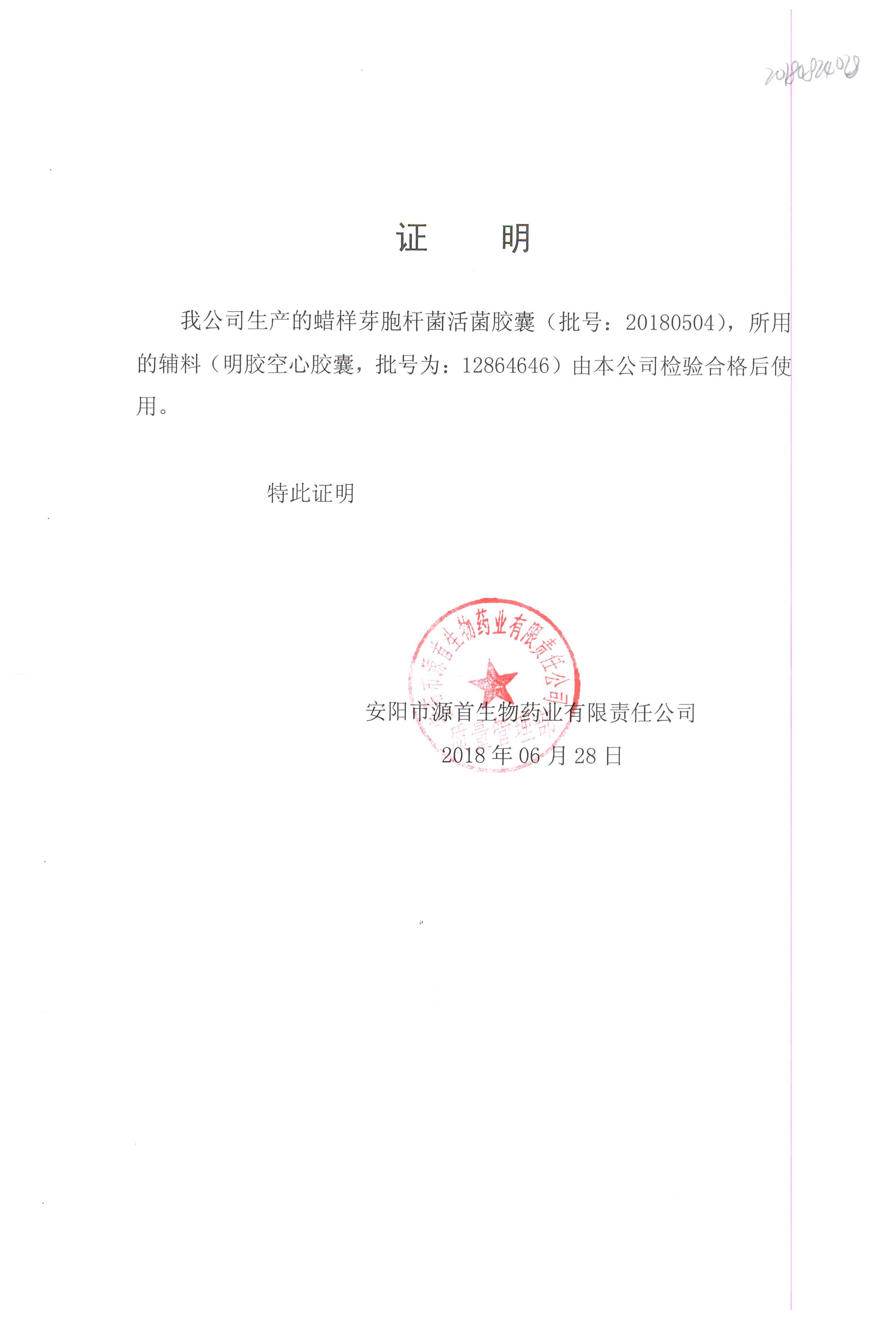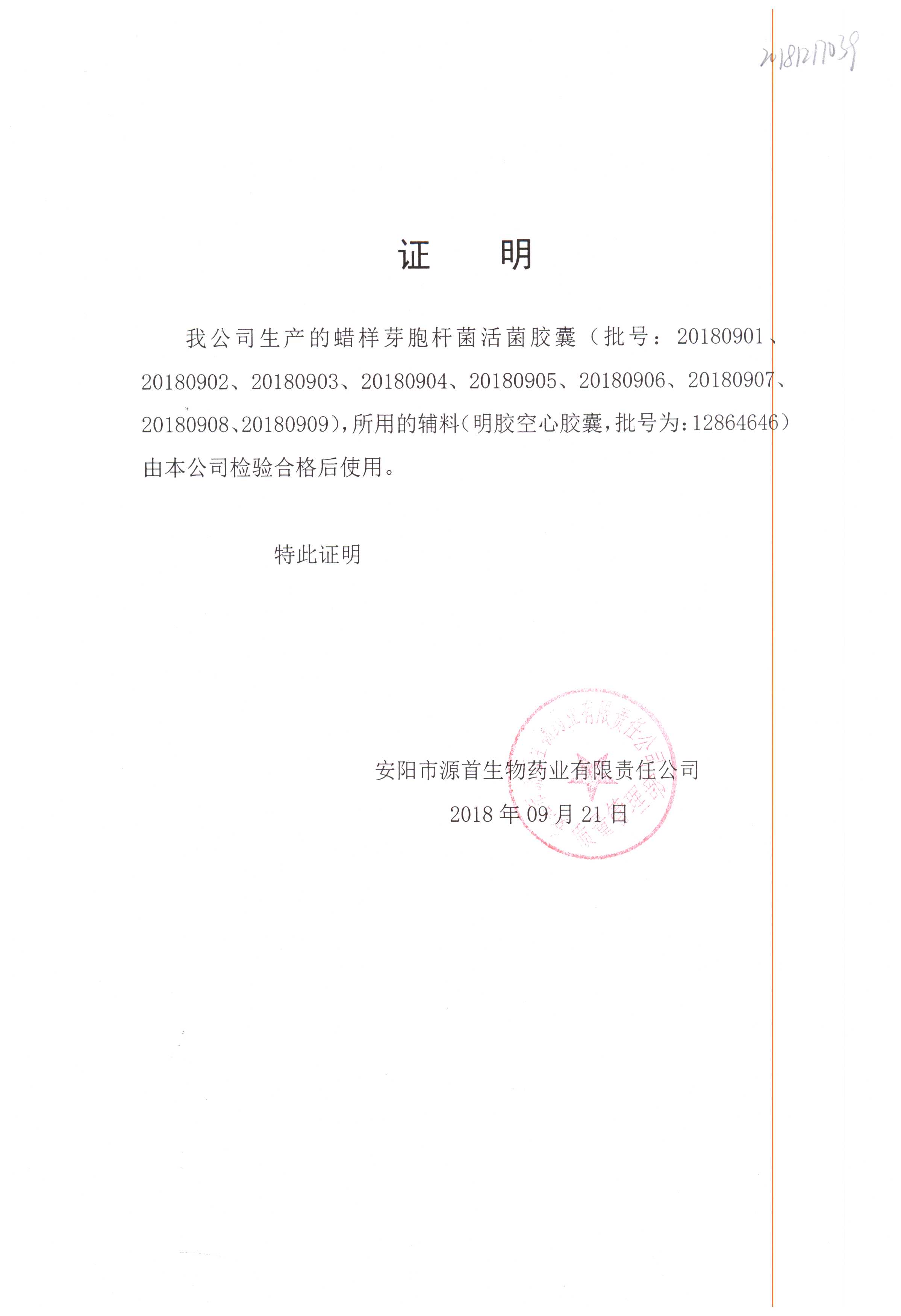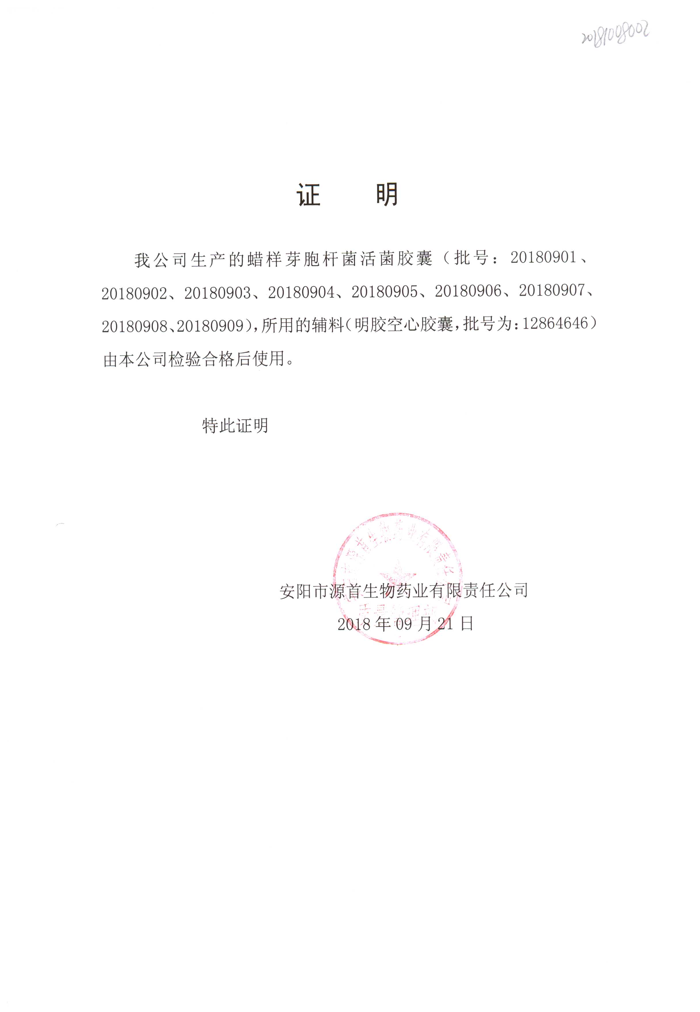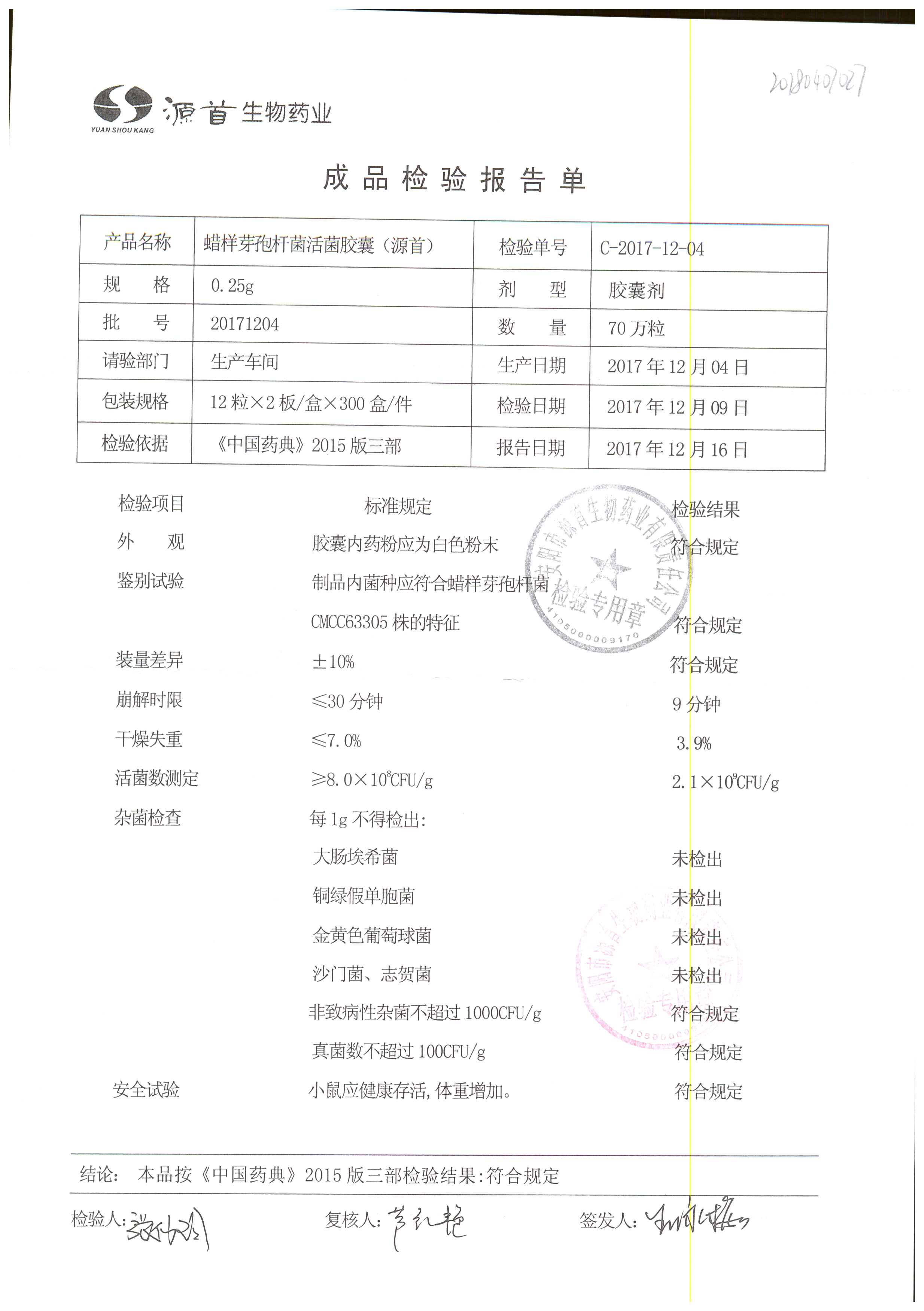 | 蠟樣芽孢桿菌活菌膠囊(源首) | 0.25g | 20180907(2/3) | 查看詳情 |