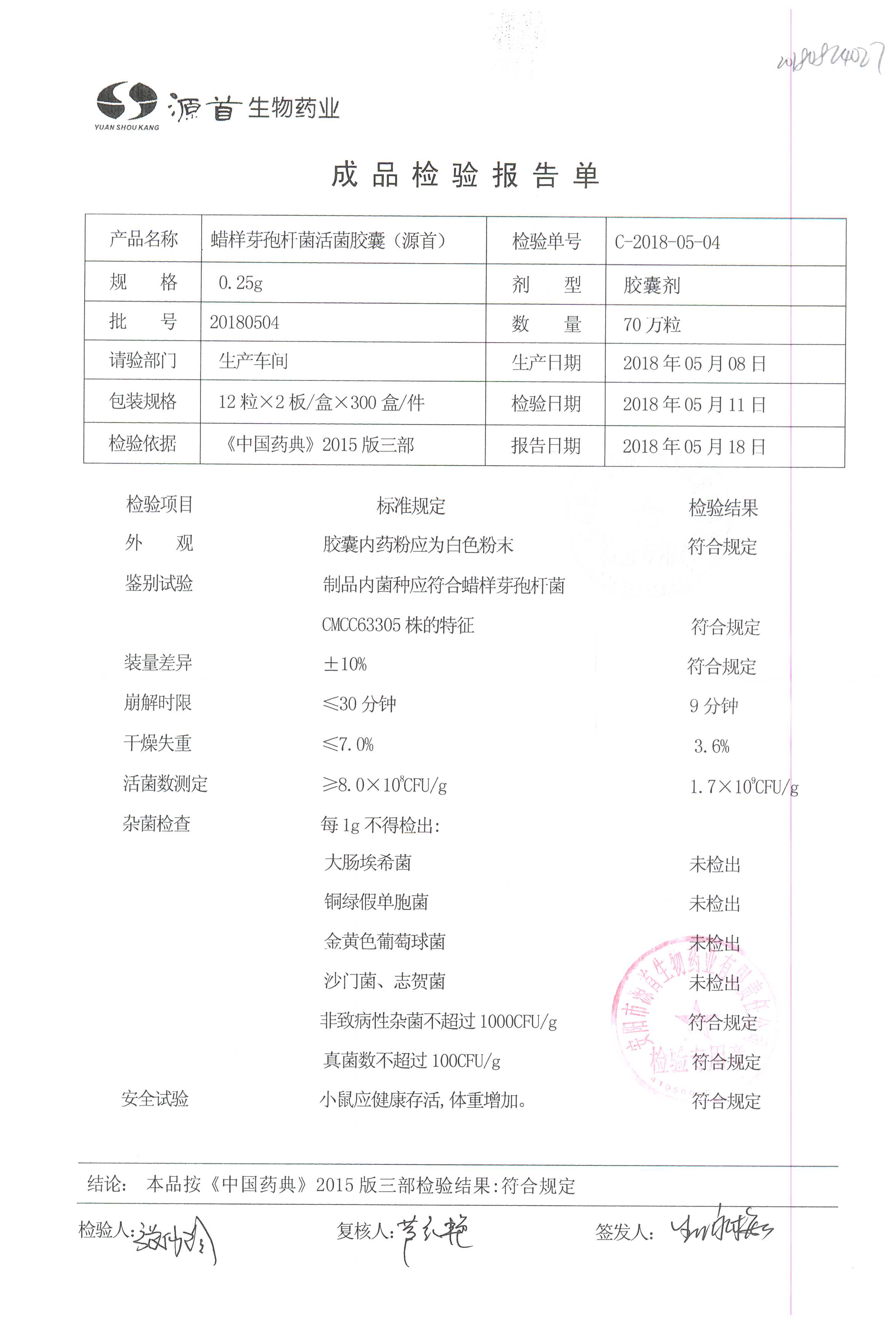 | 蠟樣芽孢桿菌活菌膠囊(源首) | 0.25g | 20180504(1/3) | 查看詳情 |