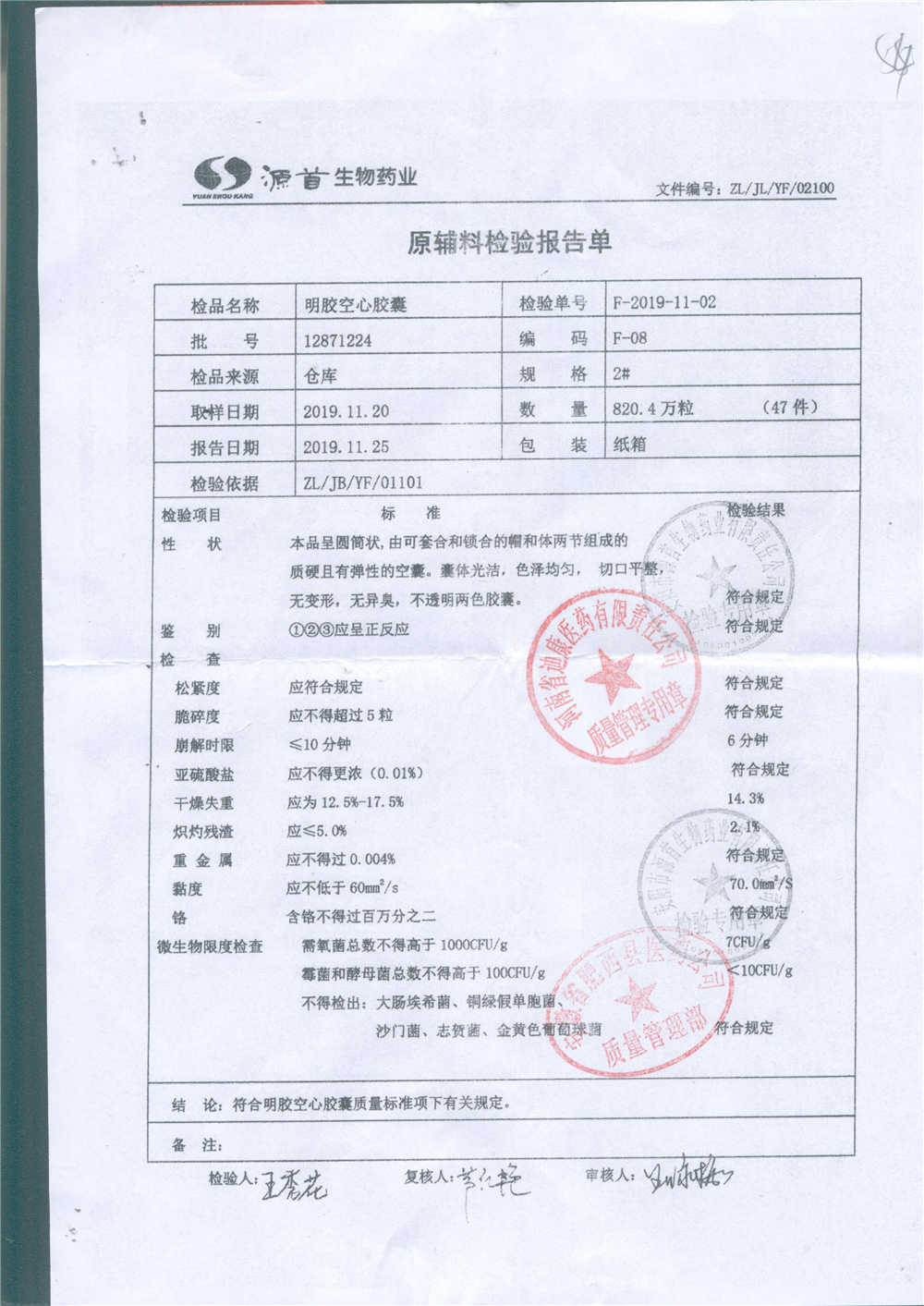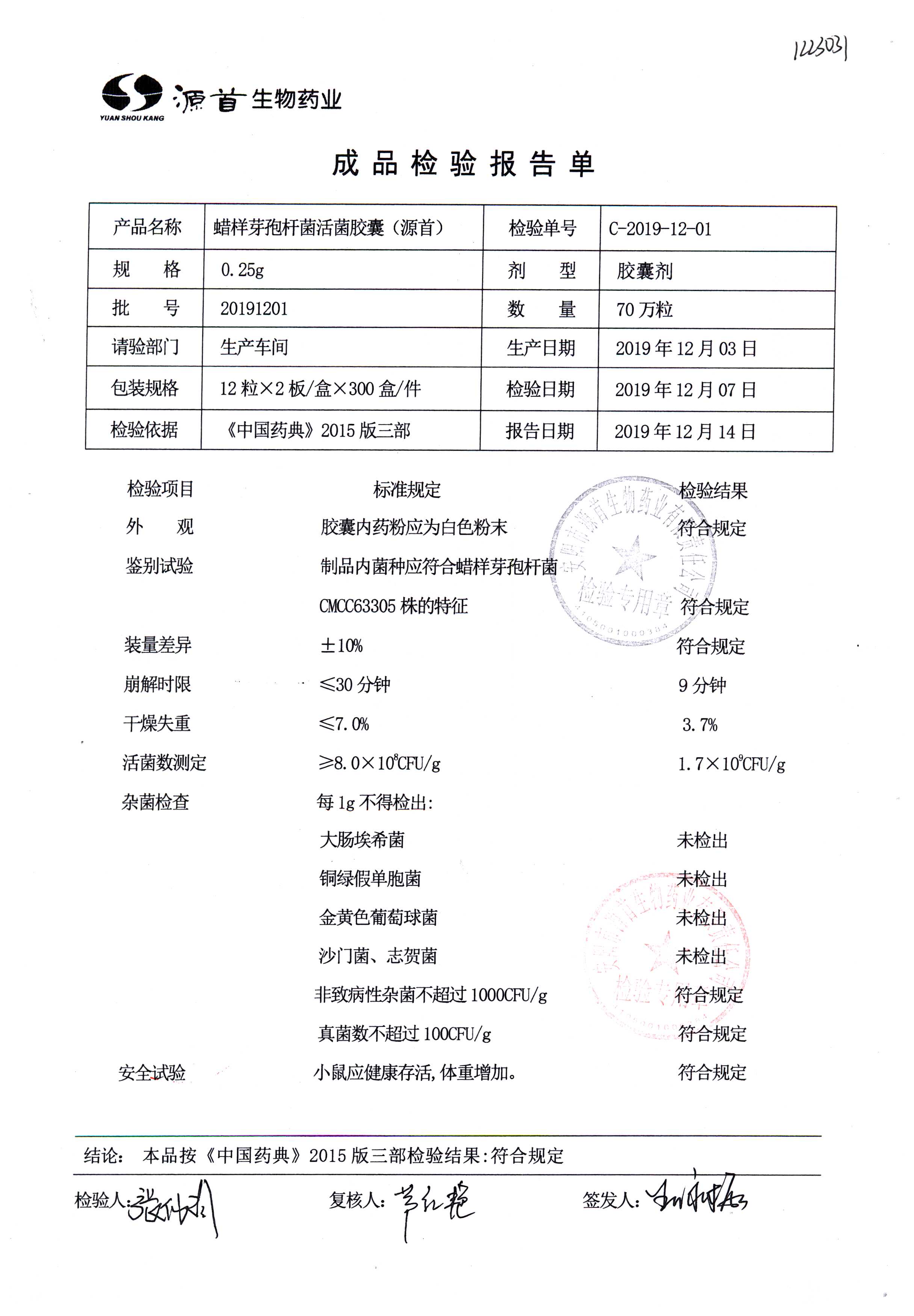 | 蠟樣芽孢桿菌活菌膠囊(源首) | 0.25g | 20191201(1/3) | 查看詳情 |