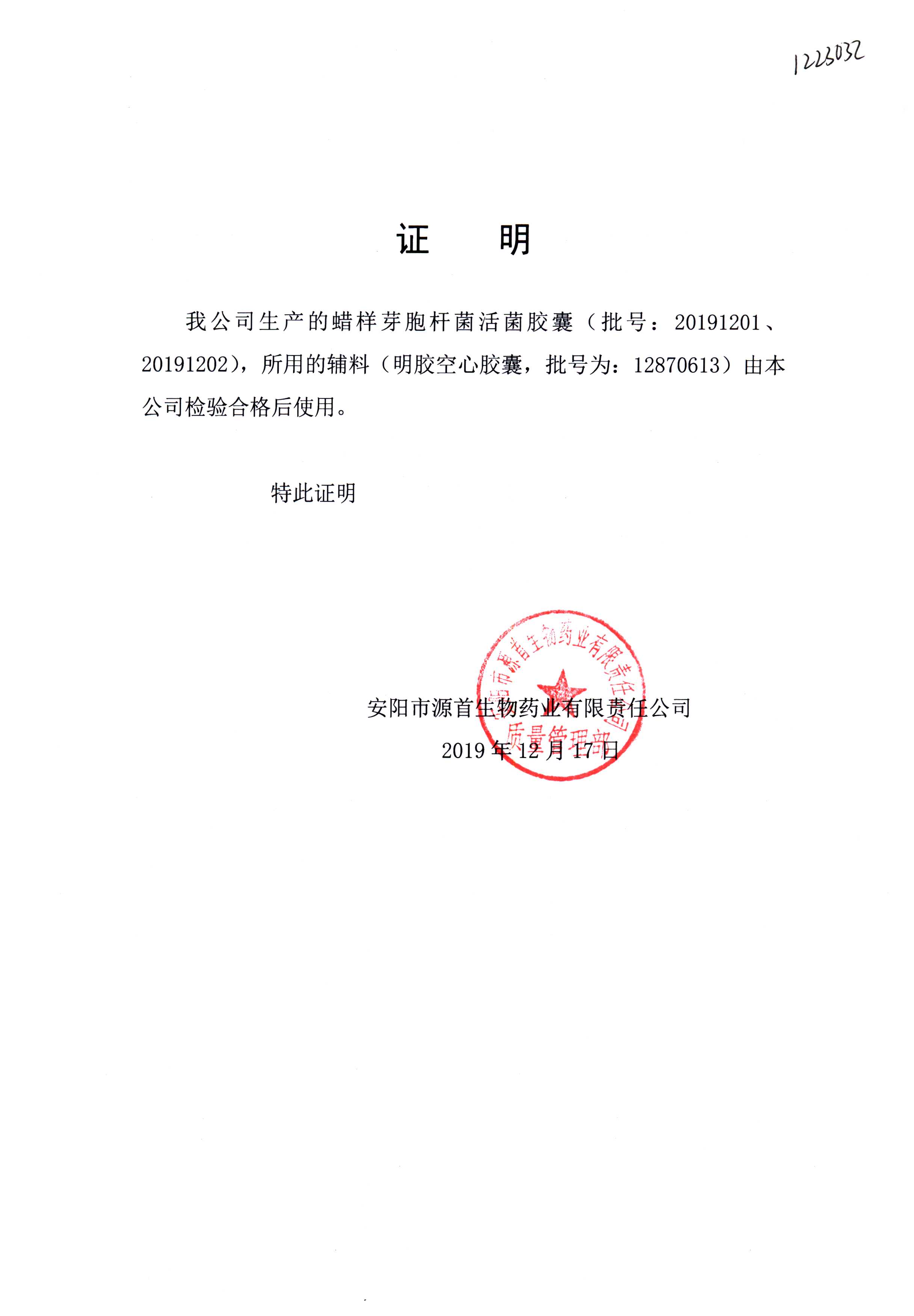 | 蠟樣芽孢桿菌活菌膠囊(源首) | 0.25g | 20191201(2/3) | 查看詳情 |