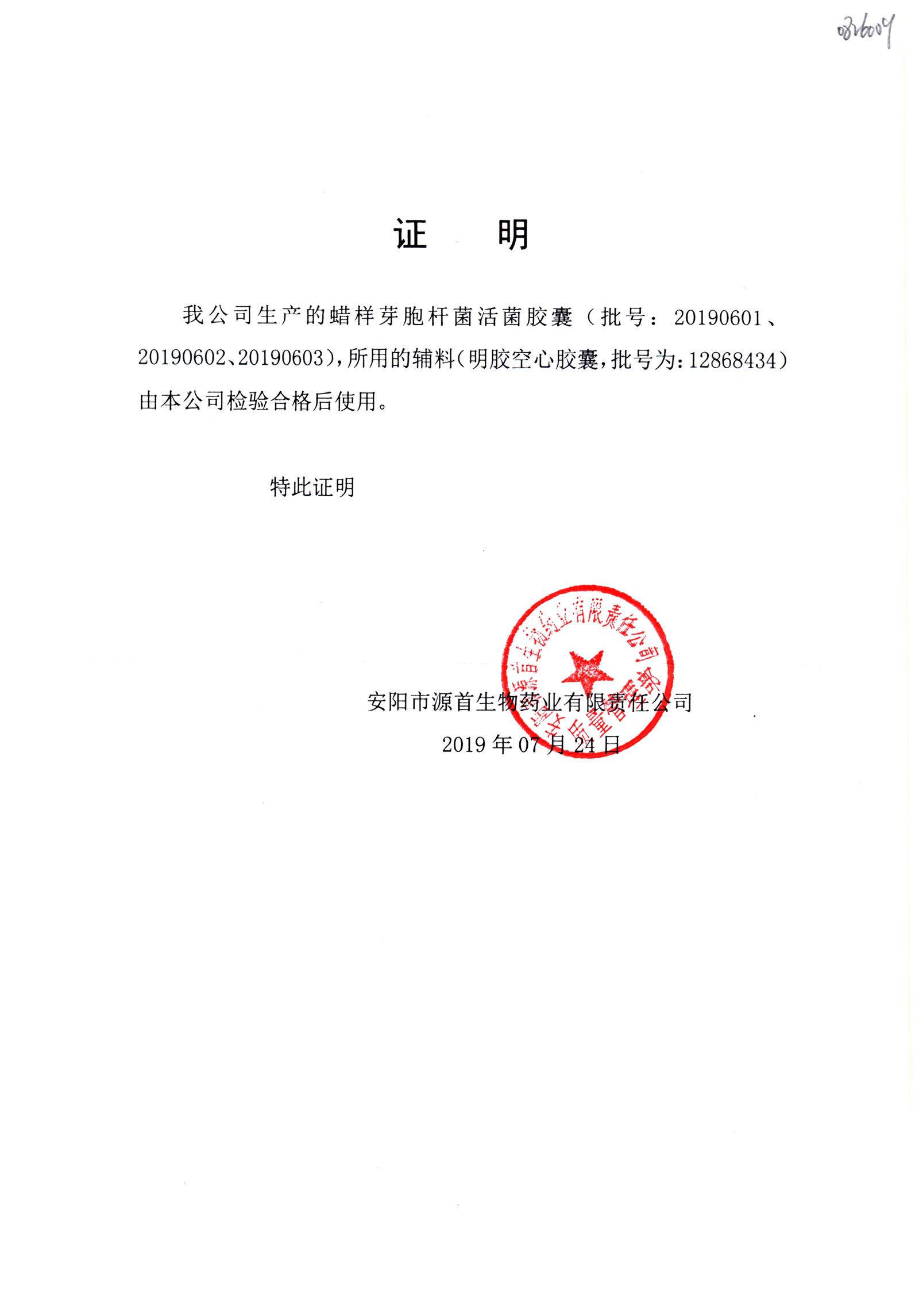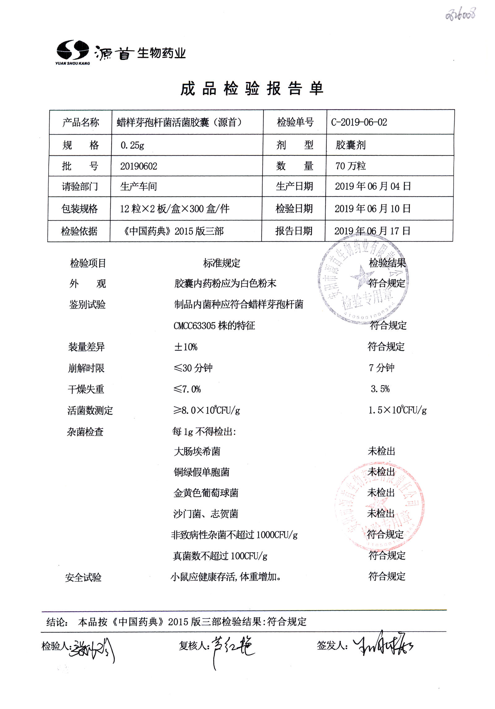 | 蠟樣芽孢桿菌活菌膠囊(源首) | 0.25g | 20190602(2/3) | 查看詳情 |