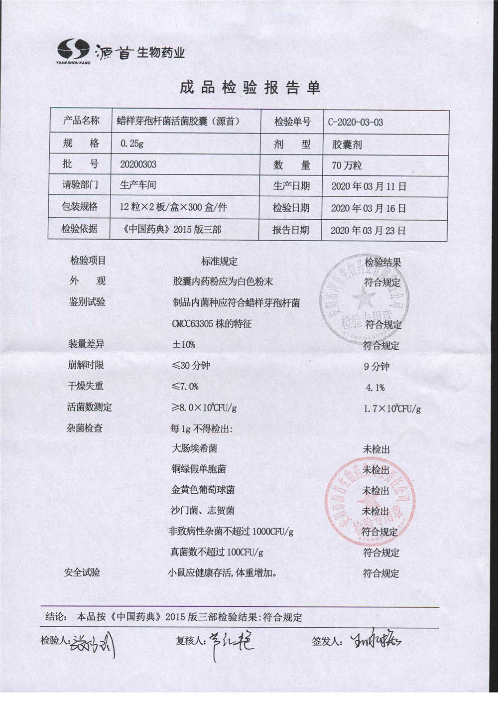 | 蠟樣芽孢桿菌活菌膠囊(源首) | 0.25g | 20200303(2/3) | 查看詳情 |