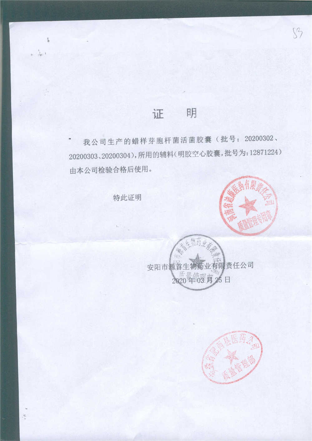 | 蠟樣芽孢桿菌活菌膠囊(源首) | 0.25g | 20200303(3/3) | 查看詳情 |