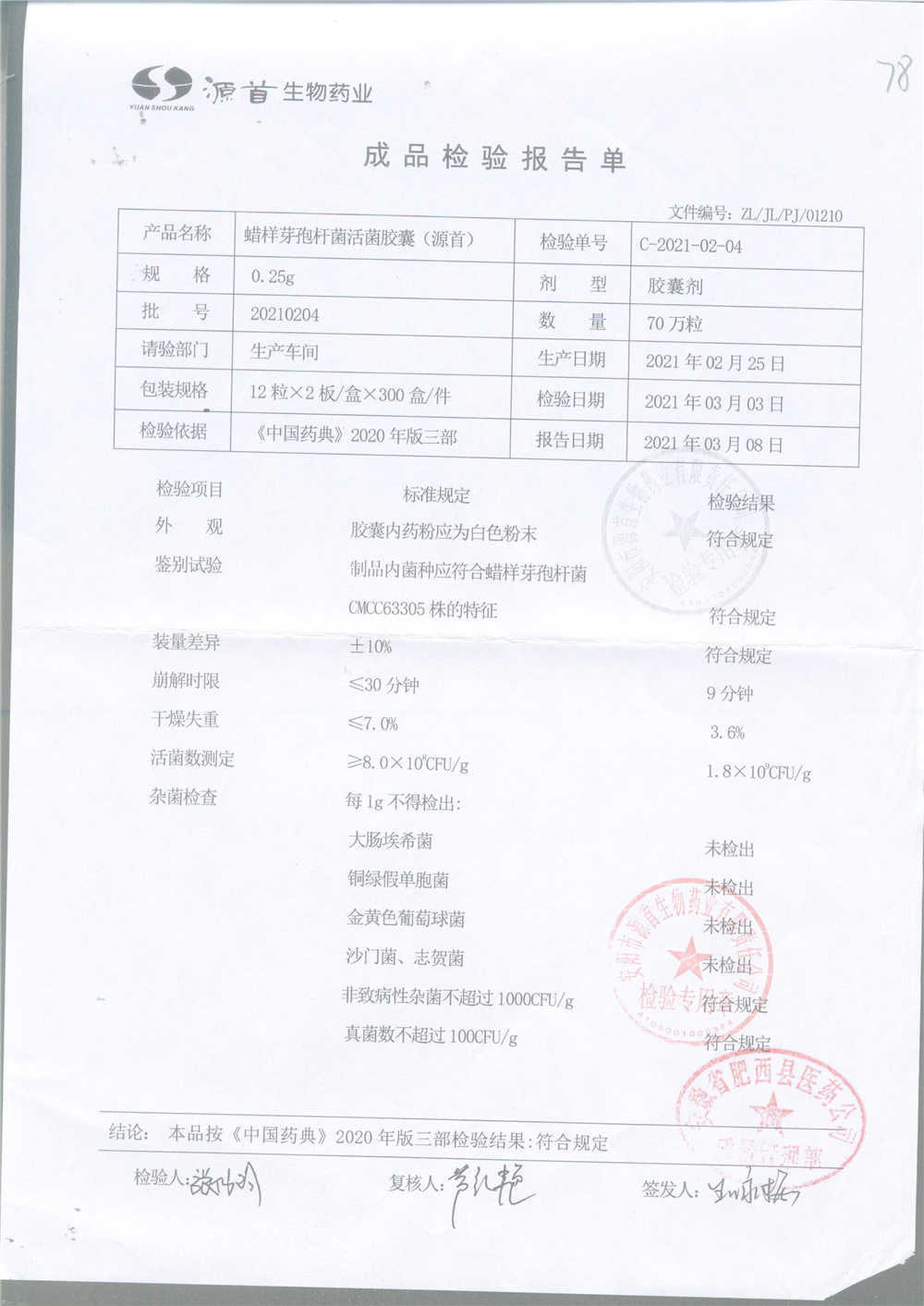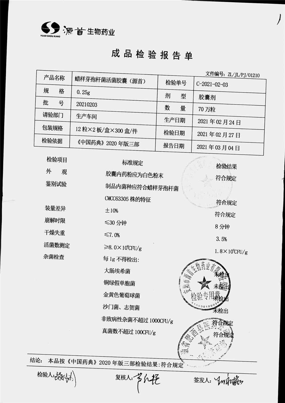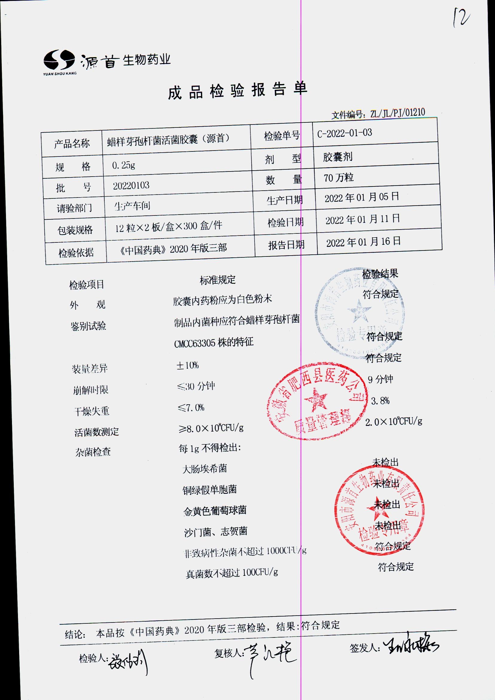 | 蠟樣芽孢桿菌活菌膠囊(源首) | 0.25g | 20210204(2/3) | 查看詳情 |