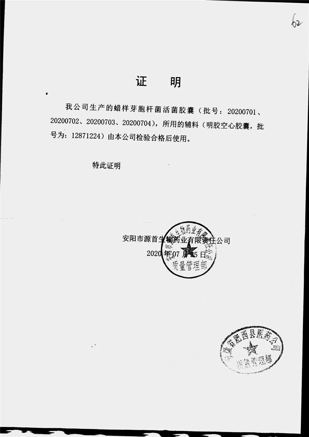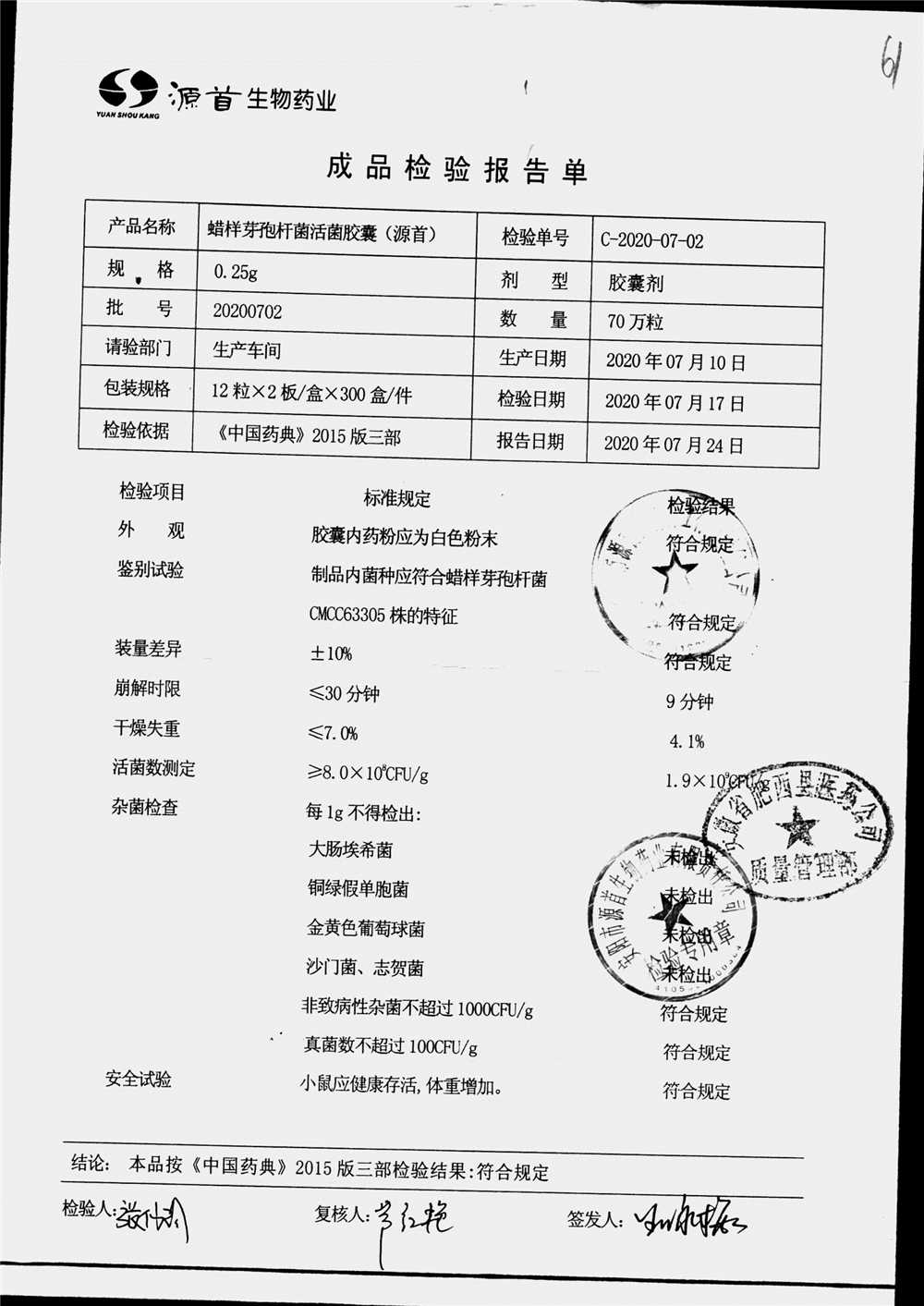 | 蠟樣芽孢桿菌活菌膠囊(源首) | 0.25g | 20200702(2/3) | 查看詳情 |