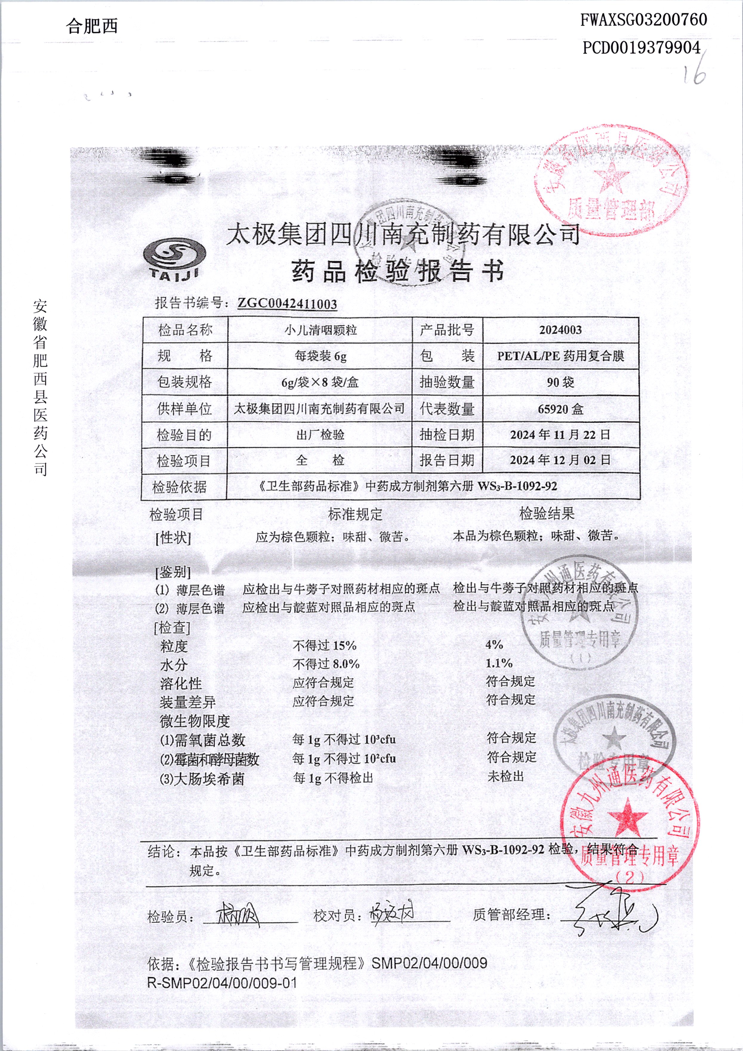 名稱 規(guī)格 批號(hào) 藥檢報(bào)告