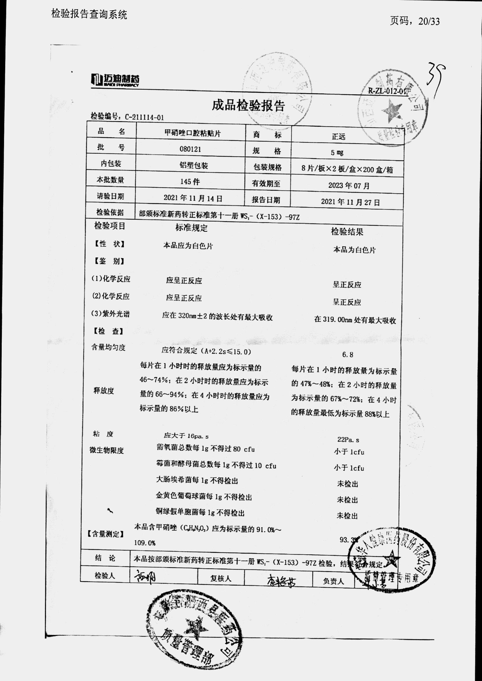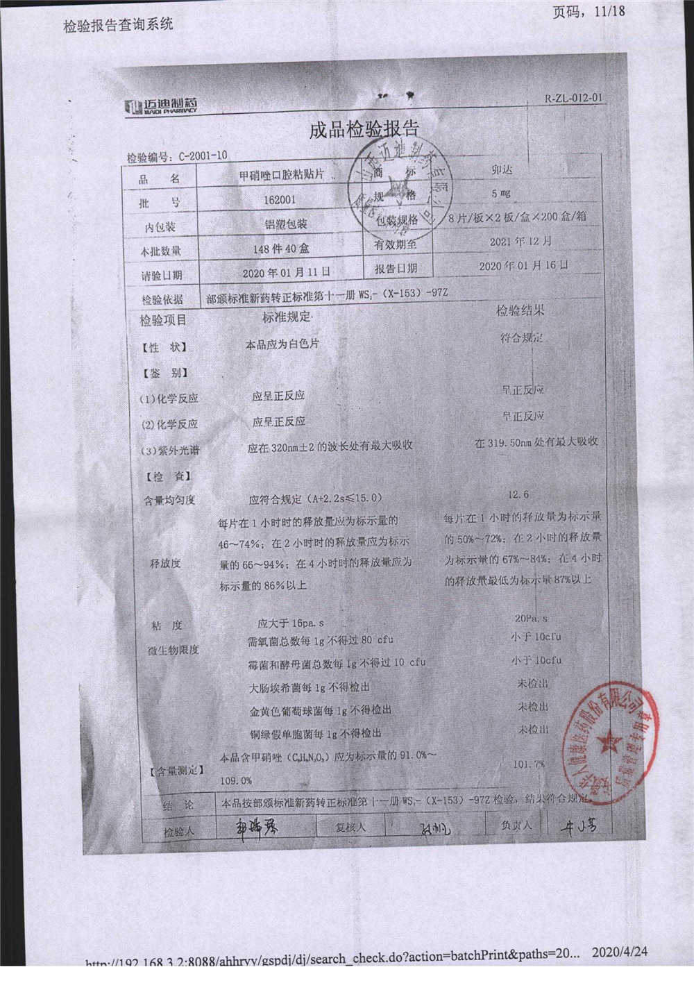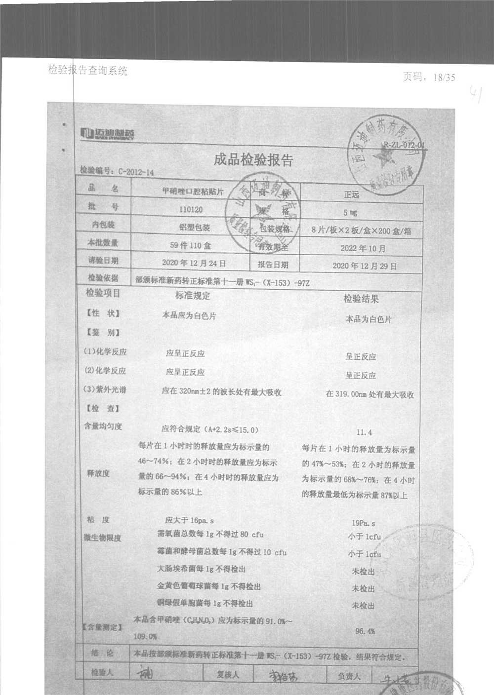 | 甲硝唑口腔粘貼片 | 5mg*16片 | 110120 | 查看詳情 |