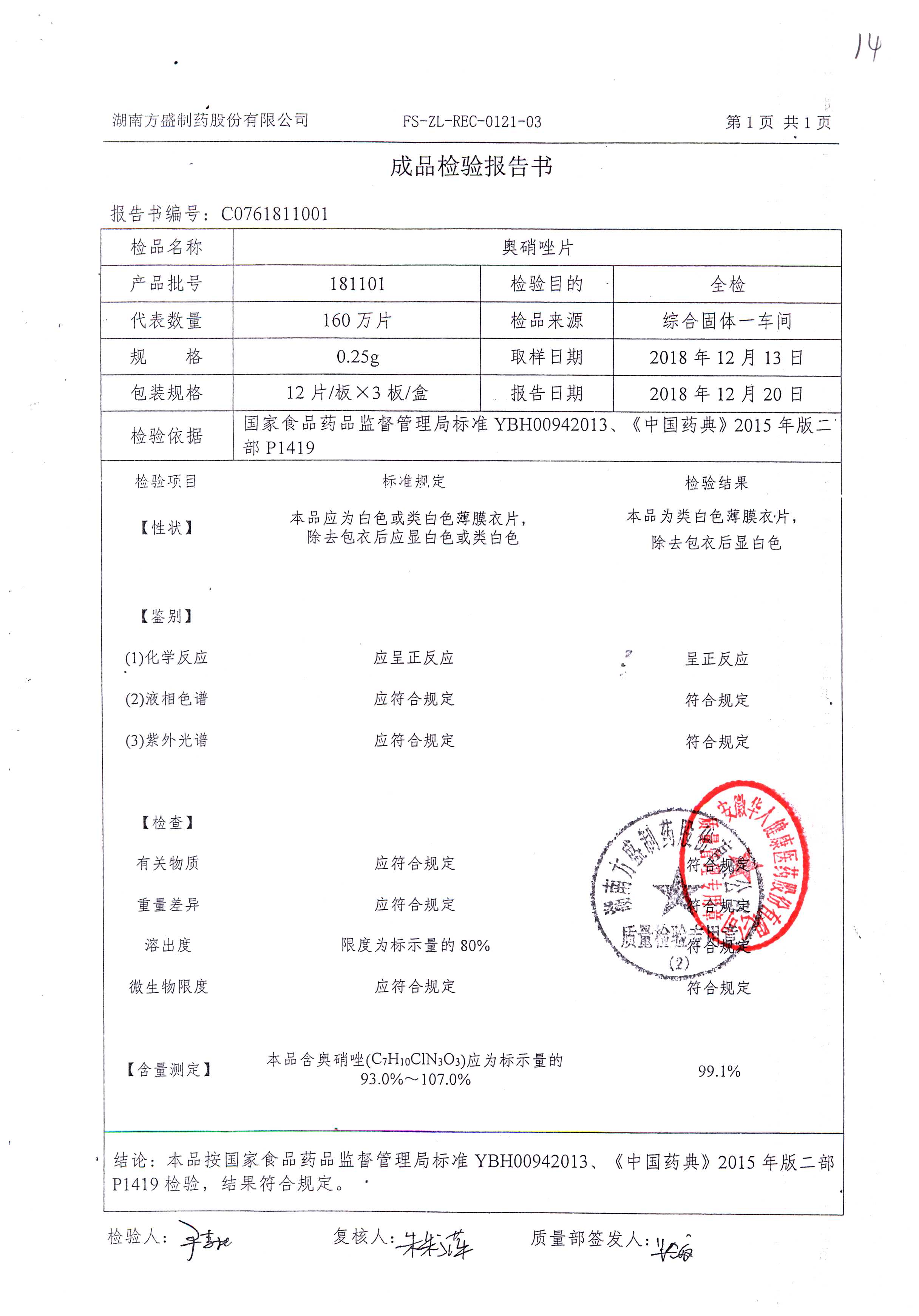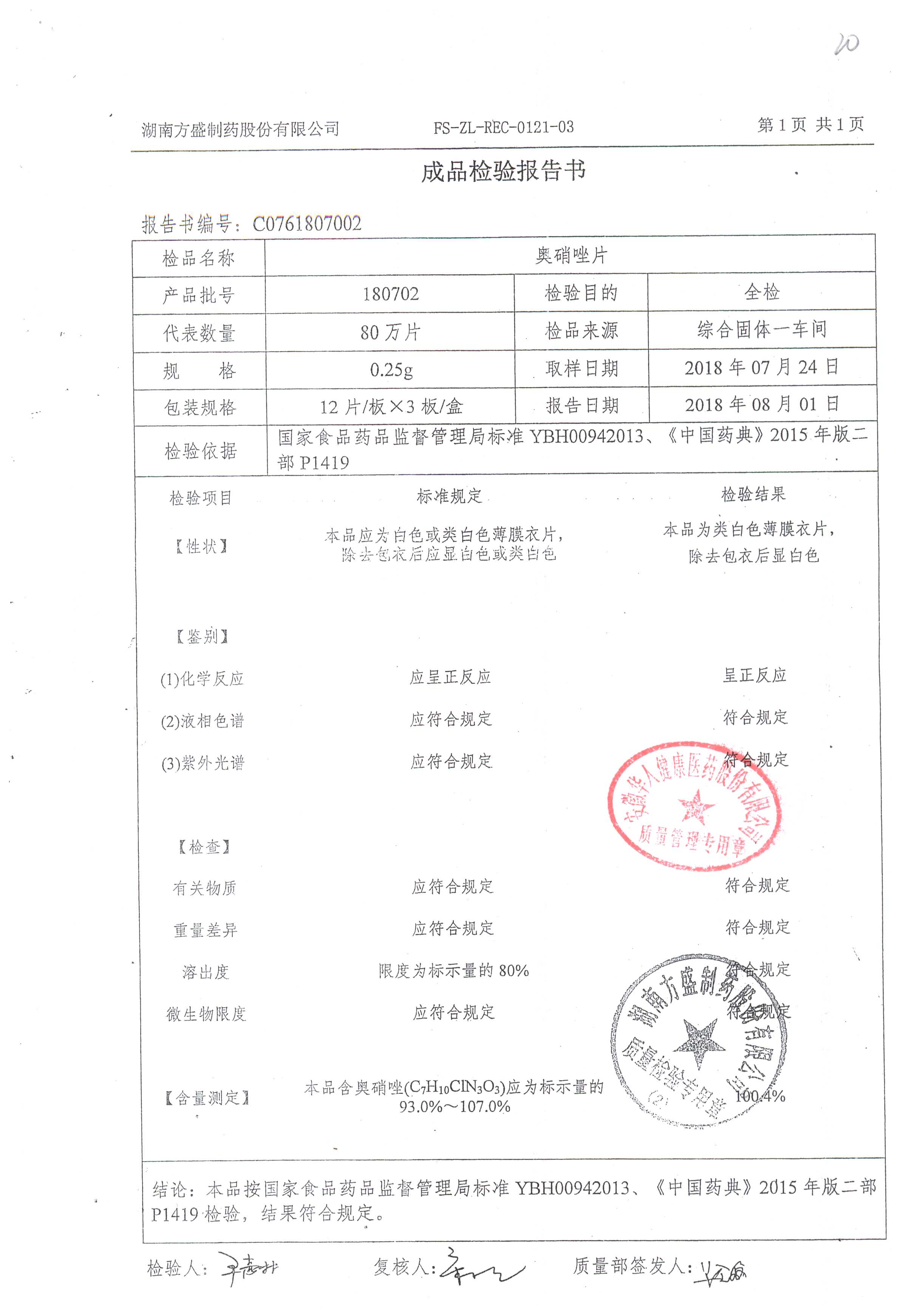 | 奧硝唑片 | 0.25g-36s | 180701 | 查看詳情 |
