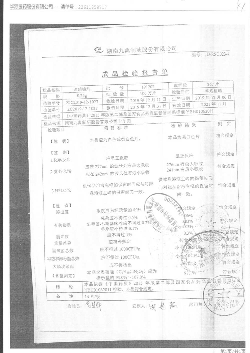 | 奧硝唑片 | 0.25g-36s | 191202 | 查看詳情 |